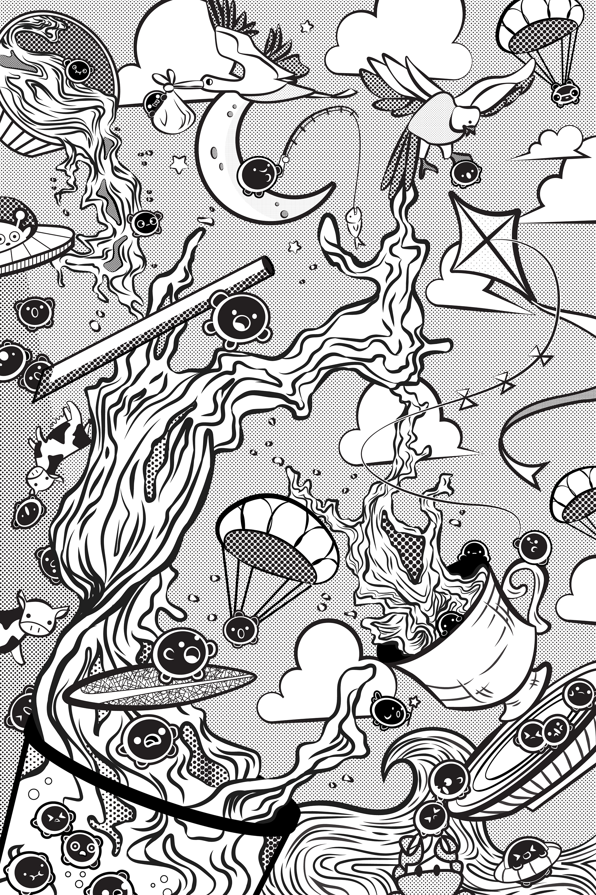 Procreate, Photoshop, and plain old pen and paper are my favorite tools for illustration. I love adding in as much detail as possible and creating textures with simple hatching techniques or digital effects.